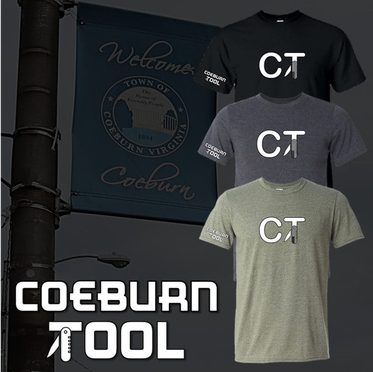 Coeburn Tool Big Lettermark Logo Dark Heather Gray Short Sleeve T-Shirt w/ coeburn tool sleeve