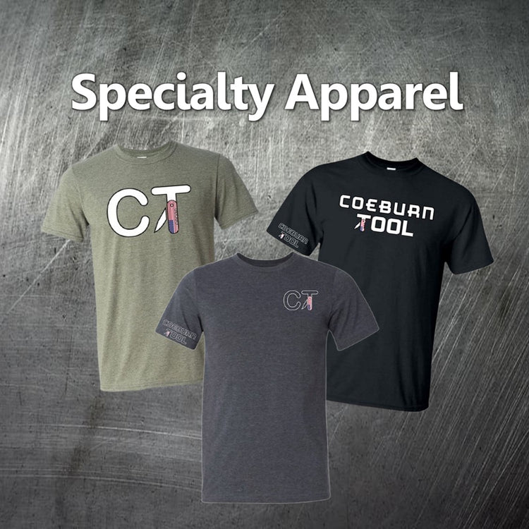 Show your love for knives, gear and Coeburn Tool with our specialty designed t-shirts. Now you (and anyone you know) can represent your favorite knife brand with our unique apparel options. All our t-shirts are available in an assortment of sizes from Large to 2XL and come in 3 different color variations; Black, Dark Heather Gray and Heather Green.